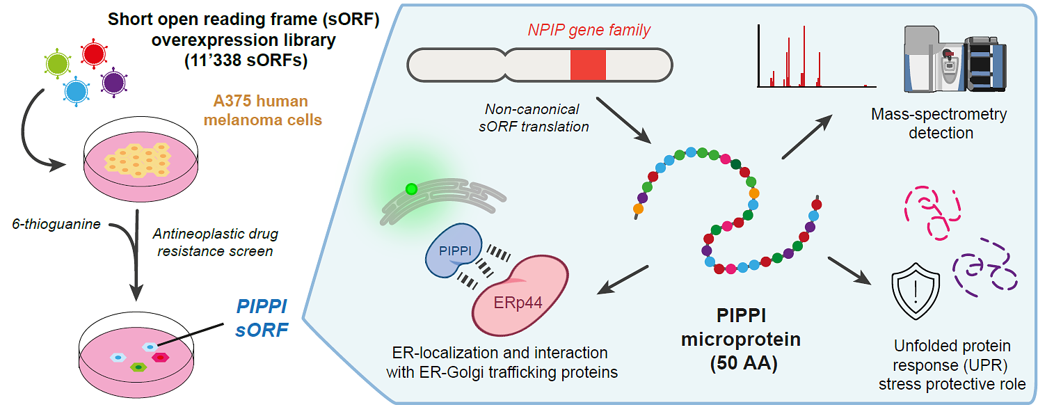 In our study, we used pooled overexpression screens using a curated library of over 11,000 sORFs and then performed phenotypic screens to discover microproteins that confer resistance to cancer cells undergoing selective pressure (in this case, treatment with nucleotide analogue 6-thioguanine). Did we find anything of note? Yes we did! Here, we describe PIPPI, a microprotein from the Morpheus gene cluster (criminally underrated, I mean, under-investigated locus despite evolutionary conservation) that localizes to and interacts with proteins in the endoplasmic reticulum to regulate ER stress response in cancer cells. Read more here